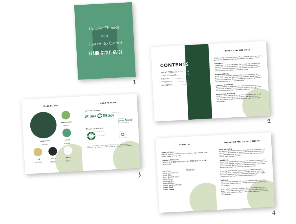 My guide addresses logo usage, color palette, typography, and tone of voice. The color scheme was chosen to highlight the brand’s sustainability concern while remaining adaptable across print and digital applications. To provide a bit of personality without sacrificing legibility, the typography combined Avenir for clean everyday use with “Potato Light,” the unusual typeface from the Uptown Threads logo.