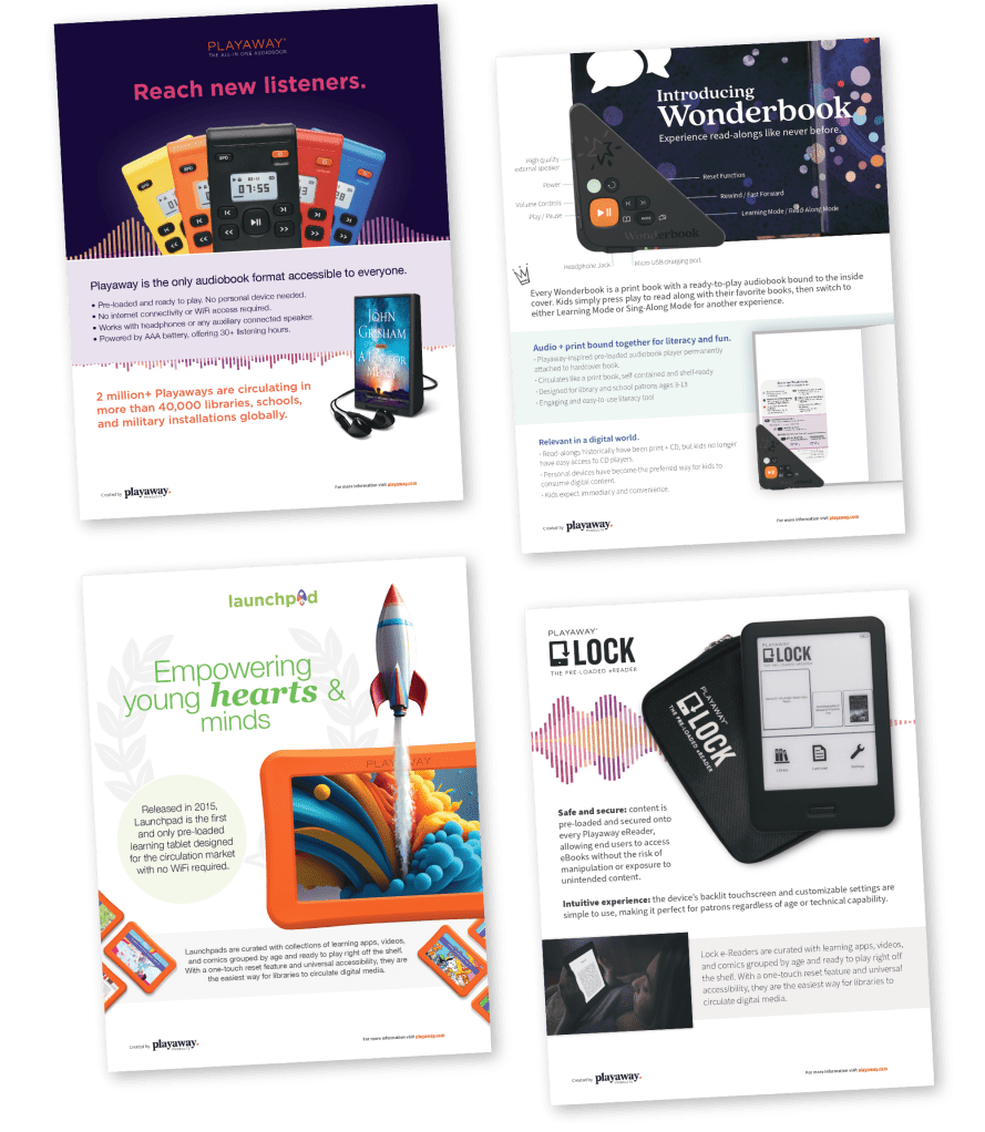 Each one-sheet adhered strictly to Playaway’s updated brand guidelines to ensure consistency across the full series of sheets. For a company with multiple product lines targeting overlapping audiences, that visual coherence was as important as the content itself.