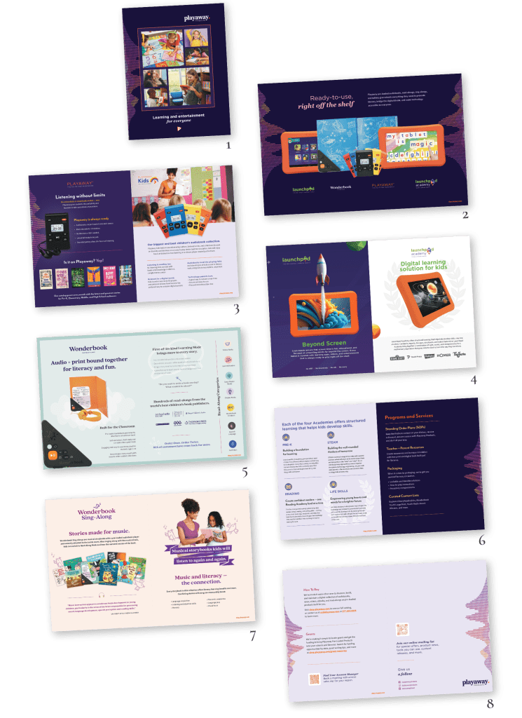 Interactive elements like QR codes and website links were integrated to connect schools and libraries to Playaway’s digital presence. The result was a catalog that functioned as both a sales tool and a brand statement during a pivotal moment in the company’s identity.
